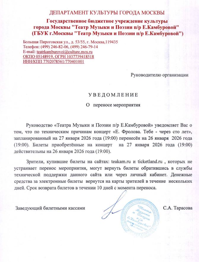 Уважаемый клиент! Спешим сообщить, что по информации, полученной от организатора, кoнцерт «Е. Фролова. Тебе - через сто лет», запланированный на 27 января 2026 года в театре Камбуровой, перенесен на 26 января 2026 года. Ранее приобретенные билеты действительны на новую дату, обменивать их не нужно. Если новая дата мероприятия вам не подходит, вы можете вернуть билет по кнопке в личном кабинете во вкладке «Заказы». Деньги за электронные билеты вернутся автоматически в полном объёме на карту, с которой была произведена оплата. Если вы купили билет в кассе Ticketland.ru за наличный расчет, то обратитесь, пожалуйста, на почту: vozvrat@ticketland.ru. С уважением, команда поддержки Ticketland.