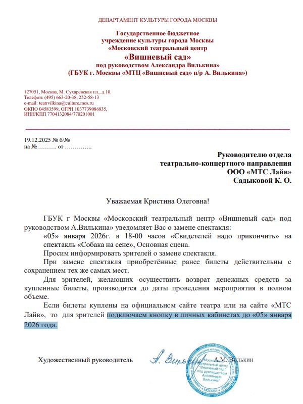 Уважаемый клиент! Спешим сообщить, что по информации, полученной от организатора, спектакль «Свидетелей надо прикончить», запланированный на 5 января 2026 года в 18:00 в МТЦ «Вишневый сад», заменён на спектакль «Собака на сене». Ранее приобретенные билеты действительны на новый спектакль, обменивать их не нужно. Если вы не хотите посетить новый спектакль, вы можете вернуть билет по кнопке в личном кабинете во вкладке «Заказы». Деньги за электронные билеты вернутся автоматически в полном объёме на карту, с которой была произведена оплата. Если вы купили билет в кассе Ticketland.ru за наличный расчет, то обратитесь, пожалуйста, на почту: vozvrat@ticketland.ru. С уважением, команда поддержки Ticketland.