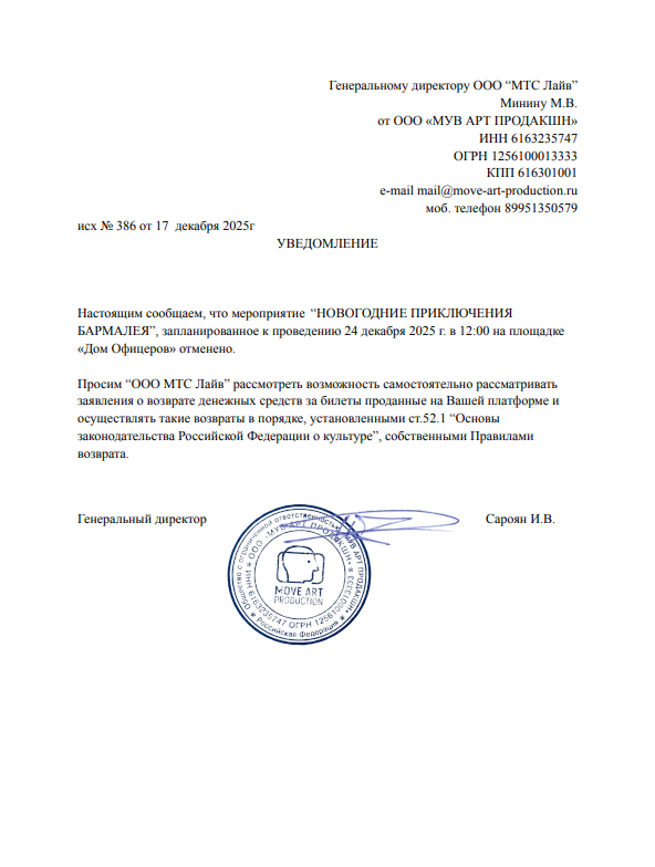 Уважаемый клиент! Спешим сообщить, что по информации, полученной от организатора, спектакль «Новогодние приключения Бармалея», запланированный на 2025-12-24 в 12:00 в Доме офицеров Южного Военного округа, отменён. Деньги за электронные билеты вернутся автоматически в полном объёме на карту, с которой была произведена оплата. Если вы купили билет в кассе Ticketland.ru за наличный расчет, то обратитесь, пожалуйста, на почту: vozvrat@ticketland.ru. С уважением, команда поддержки Ticketland.