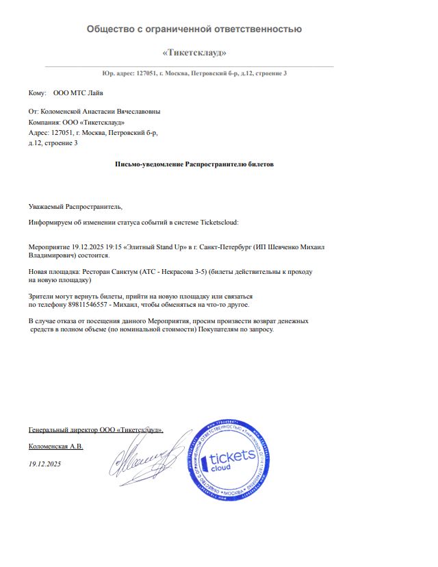 Уважаемый клиент! Спешим сообщить, что по информации, полученной от организатора, концерт «Элитный Stand Up», запланированный на 19 декабря 2025 года в 19:15 в ресторане «Квартира 8», перенесён. Новое место проведения концерта: Ресторан Cанктум (АТС - Некрасова 3-5) Зрители могут вернуть билеты, прийти на новую площадку или связаться по телефону 8-981-154-65-57 - Михаил, чтобы обменяться на что-то другое. Ранее приобретенные билеты действительны на новую площадку, обменивать их не нужно. Если вам не удобно посетить концерт на новой площадке, вы можете вернуть билет по кнопке в личном кабинете во вкладке «Заказы». Деньги за электронные билеты вернутся автоматически в полном объёме на карту, с которой была произведена оплата. Если вы купили билет в кассе Ticketland.ru за наличный расчет, то обратитесь, пожалуйста, на почту: vozvrat@ticketland.ru. С уважением, команда поддержки Ticketland.