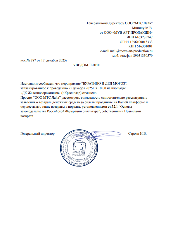 Уважаемый клиент! Спешим сообщить, что по информации, полученной от организатора, спектакль «Буратино и Дед Мороз», запланированный на 2025-12-25 в 10:00 в ДК «Железнодорожников», отменён. Деньги за электронные билеты вернутся автоматически в полном объёме на карту, с которой была произведена оплата. Если вы купили билет в кассе Ticketland.ru за наличный расчет, то обратитесь, пожалуйста, на почту: vozvrat@ticketland.ru. С уважением, команда поддержки Ticketland.
