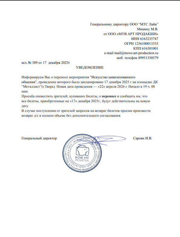 Уважаемый клиент! Спешим сообщить, что по информации, полученной от организатора, спектакль «Искусство «цивилизованного» общения», запланированный на 17 декабря 2025 г на площадке ДК«Металлист» (г.Тверь). Новая дата проведения — «22» апреля 2026 г. Начало в 19 ч. 00мин. Площадка не меняется. Ранее приобретенные билеты действительны на новую дату, обменивать их не нужно. Если вам не удобно посетить мероприятие, вы можете вернуть билет по кнопке в личном кабинете во вкладке «Заказы». Деньги за электронные билеты вернутся автоматически в полном объёме на карту, с которой была произведена оплата. Если вы купили билет в кассе Ticketland.ru за наличный расчет, то обратитесь, пожалуйста, на почту: vozvrat@ticketland.ru. С уважением, команда поддержки Ticketland